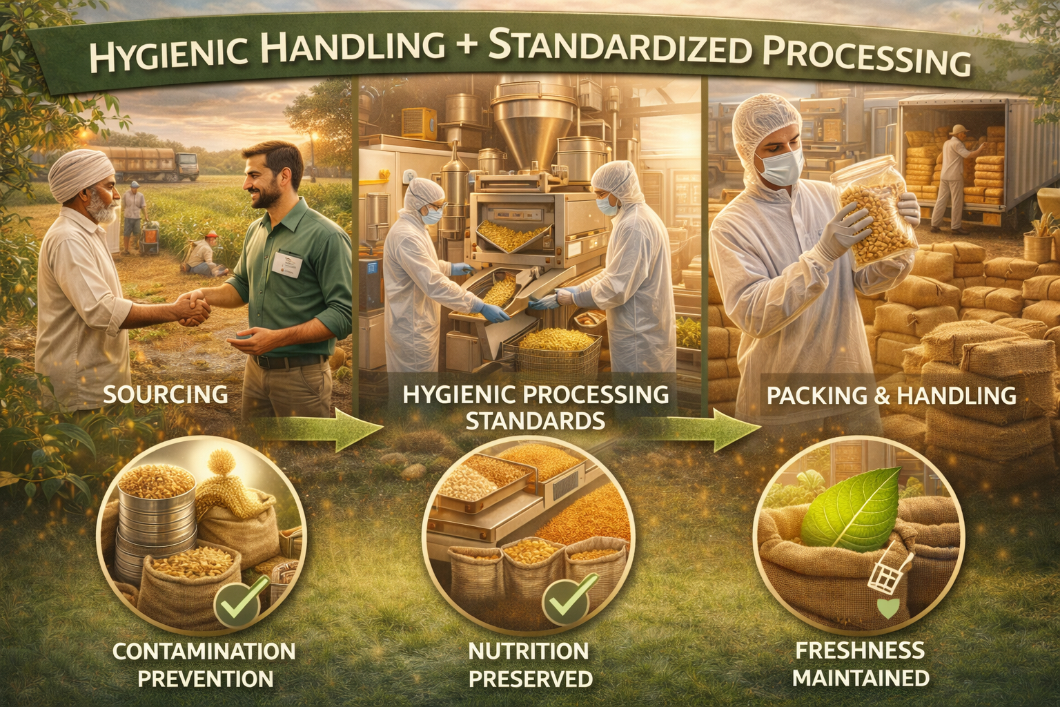 From sourcing to packing, products are handled through hygienic protocols and controlled processing standards, reducing contamination risks and preserving the natural nutrition of each commodity.