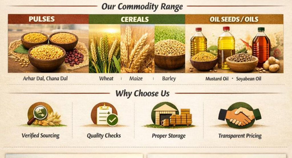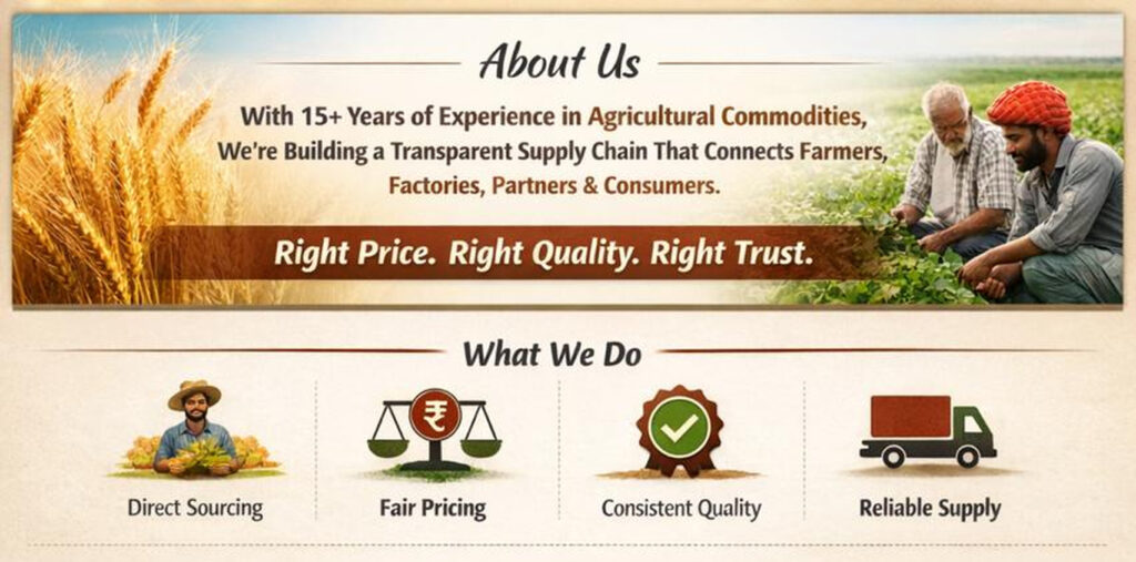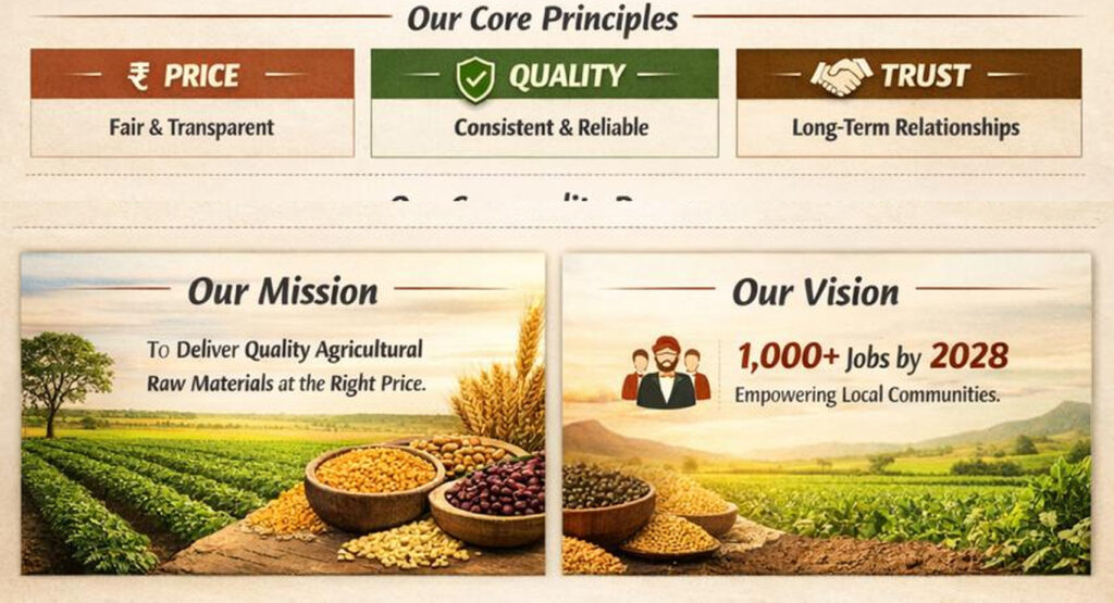 Our Mission: To simplify agri procurement through verified sourcing, standardized quality checks, and controlled processing practices that protect purity and nutrition. We focus on reliable stock availability, hygienic packaging, and efficient dispatch for smooth partner operations.